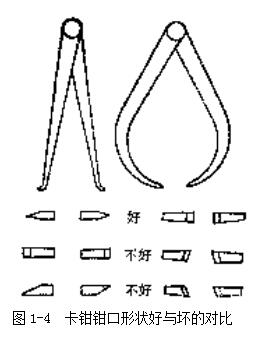 首先檢查鉗口的形狀,鉗口形狀對測量精確性影響很大,應(yīng)注意經(jīng)常修整鉗口的形狀,圖1-4所示為卡鉗鉗口形狀好與壞的對比。